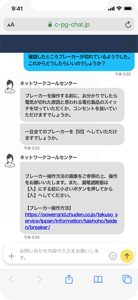 「停電情報お知らせサービス」アプリでは、お問い合わせをチャットで受け付け。